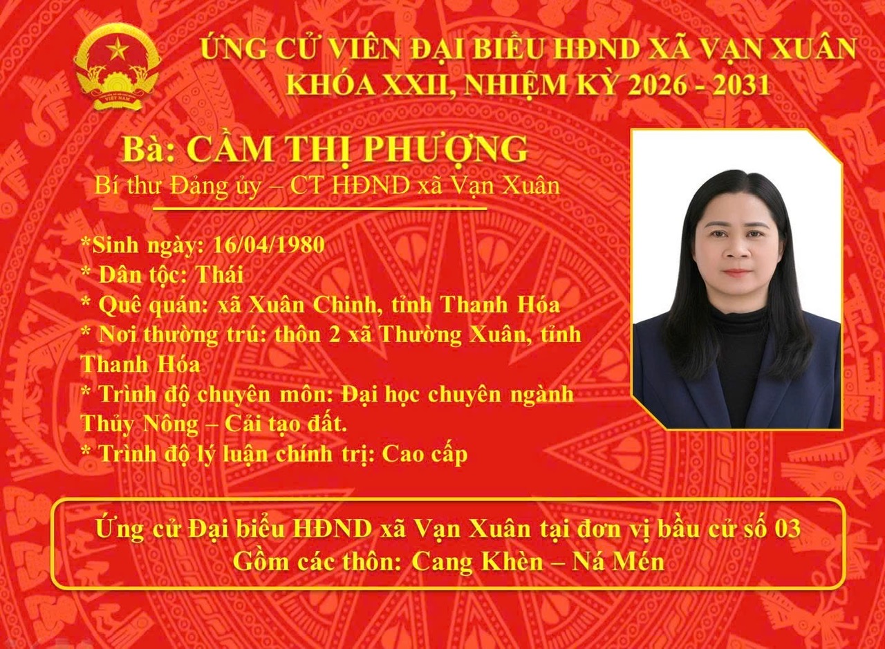 Ủy ban bầu cử xã Vạn Xuân trân trọng giới thiệu tiểu sử tóm tắt của người ứng cử đại biểu HĐND xã Vạn Xuân, nhiệm kỳ 2026 - 2031. Đơn vị bầu cử số 3 gồm các thôn Cang Khèn và Ná Mén.