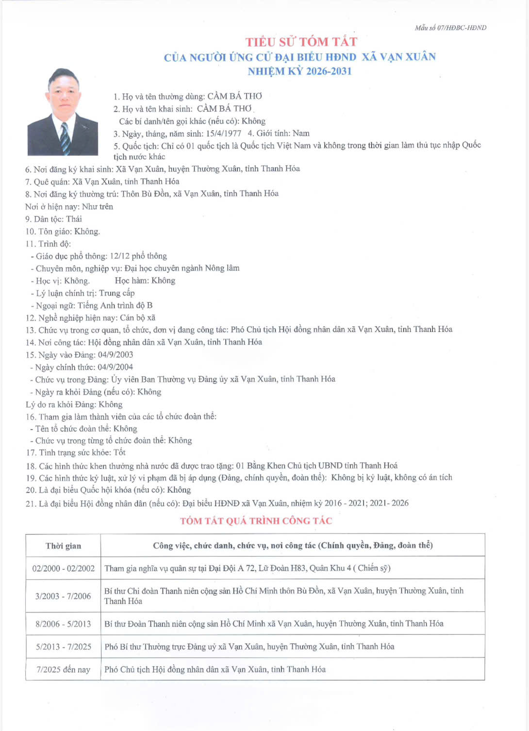TIỂU SỬ TÓM TẮT CỦA NGƯỜI ỨNG CỬ ĐẠI BIỂU HỘI ĐỒNG NHÂN DÂN XÃ VẠN XUÂN NHIỆM KỲ 2026-2030