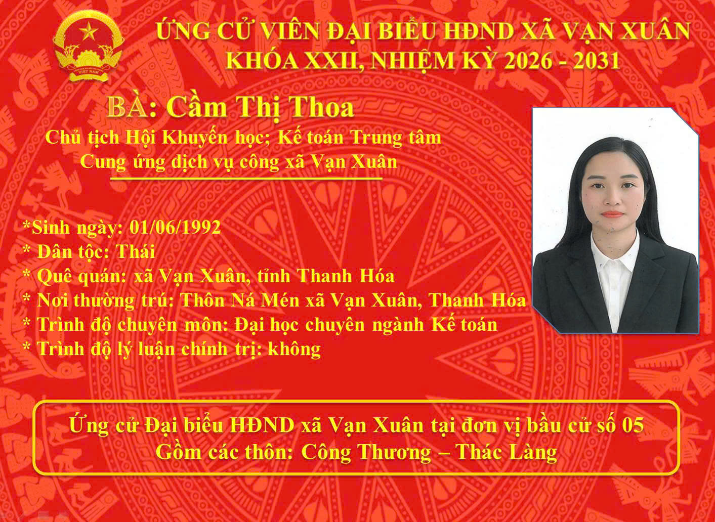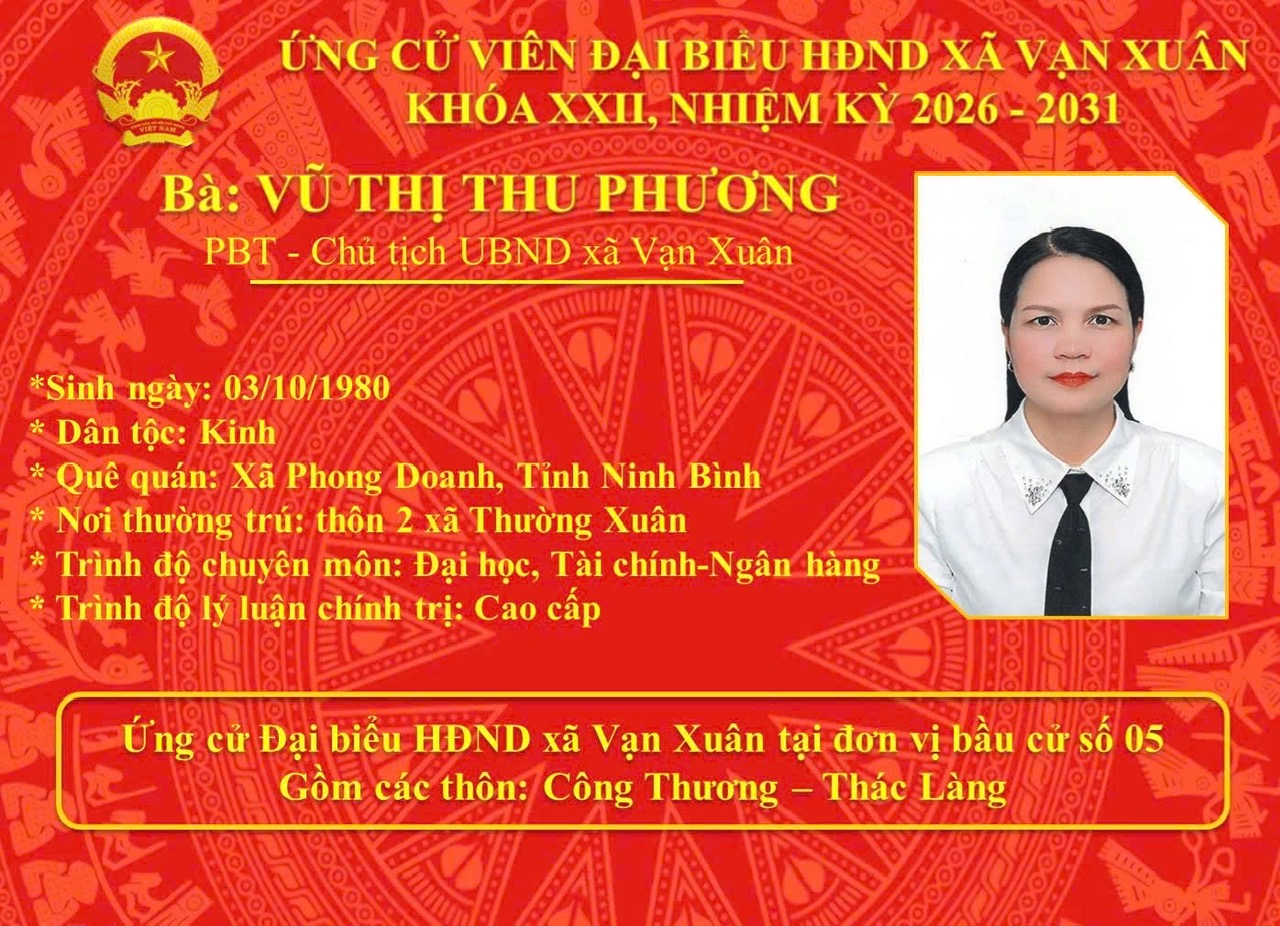 Ủy ban bầu cử xã Vạn Xuân trân trọng giới thiệu tiểu sử tóm tắt của người ứng cử đại biểu HĐND xã Vạn Xuân, nhiệm kỳ 2026 - 2031. Đơn vị bầu cử số 5 gồm các thôn Công Thương và Thác Làng.